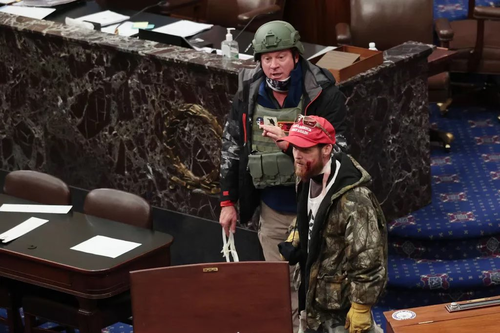 US federal authorities have arrested two men who were depicted in photos of the riot inside the Capitol wearing protective armour and carrying items that could be used to restrain a person, according to a release.